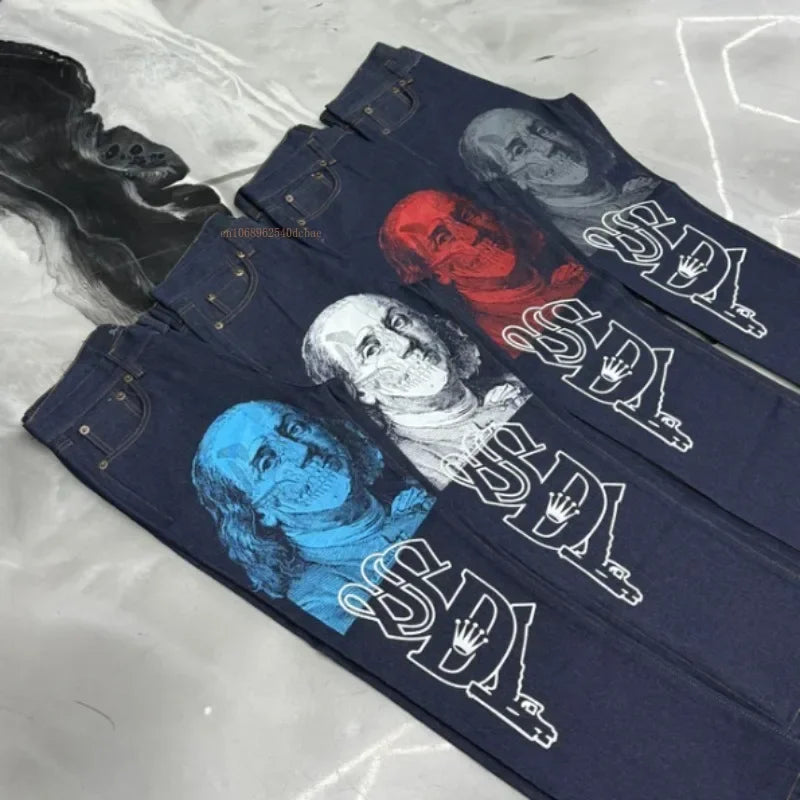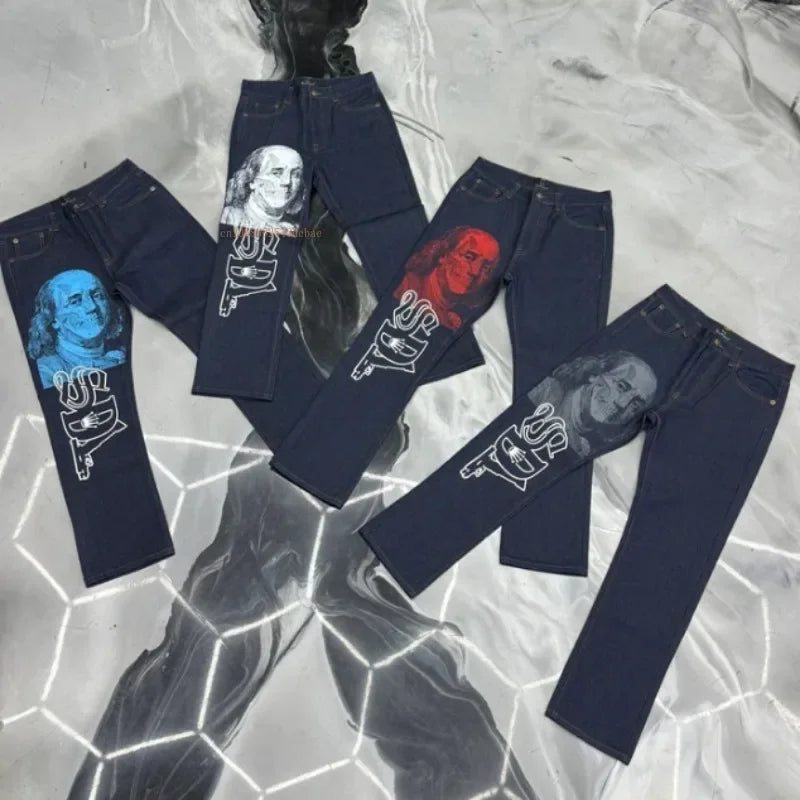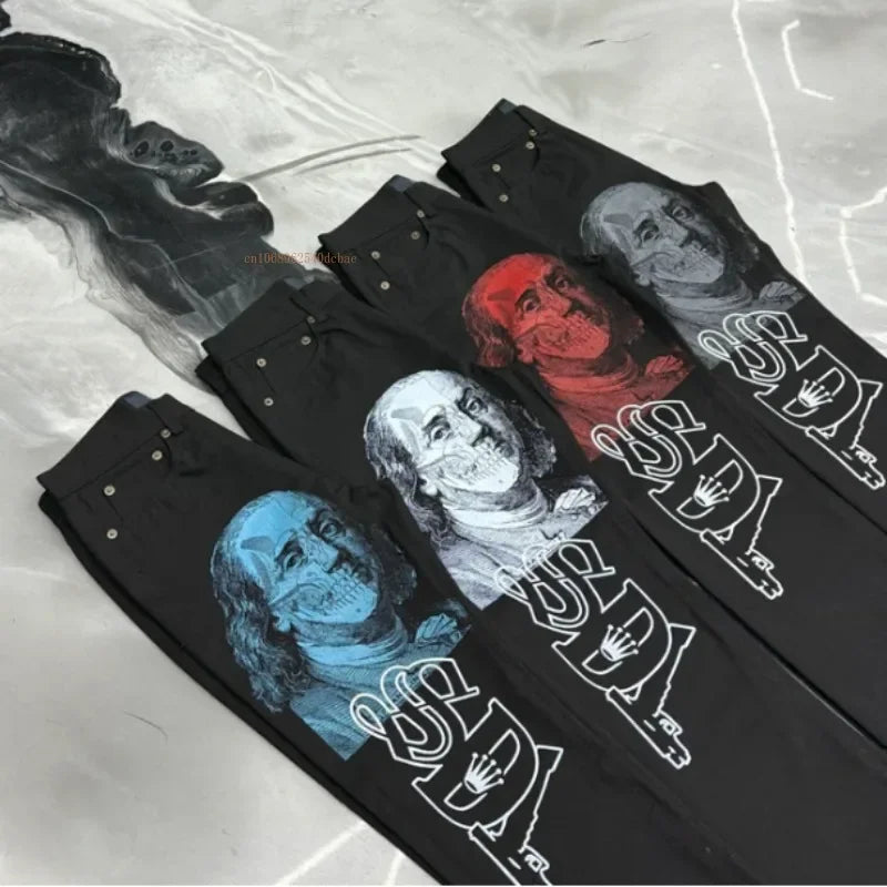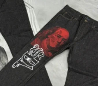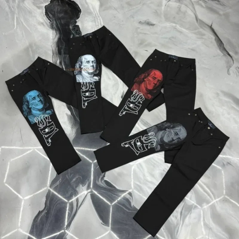 Black Straight Jeans Men Women Ins New Net Red Design Personality Printing Wide Leg Pants Winter Loose High Street Casual Jeans