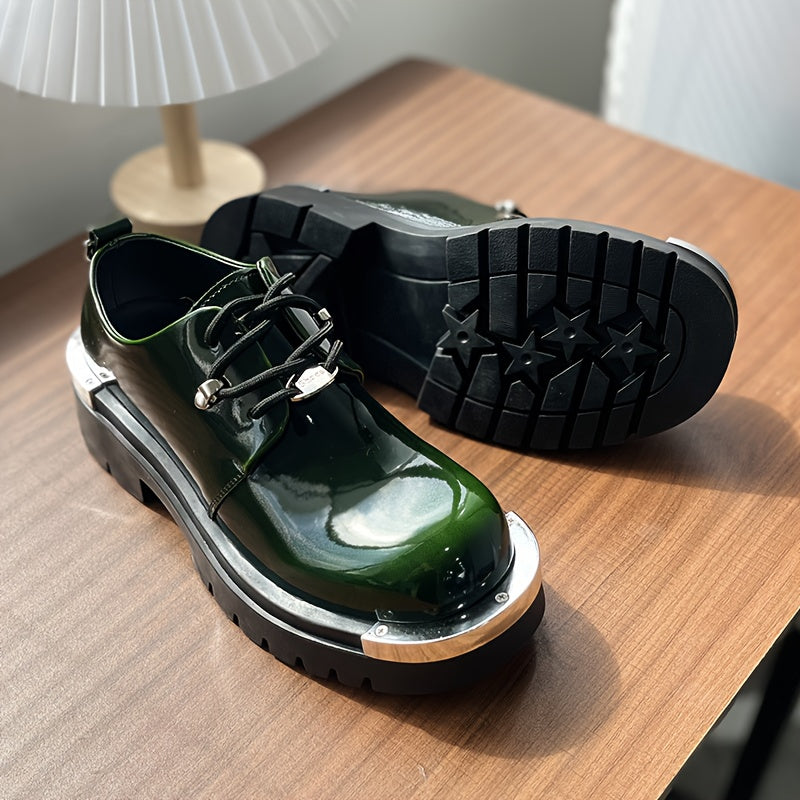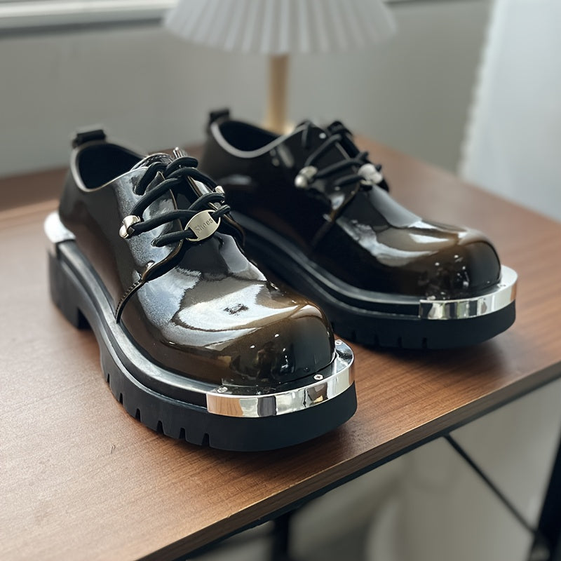 Men'S Chunky Platform Ankle Boots - Glossy Black Synthetic Cover with Golden-Tone Lace-Up Closure, Thick Rubber Sole for Height & Traction, Round Toe Design, All-Season Casual & Formal Work Boots, Formal Footwear, Durable Foo