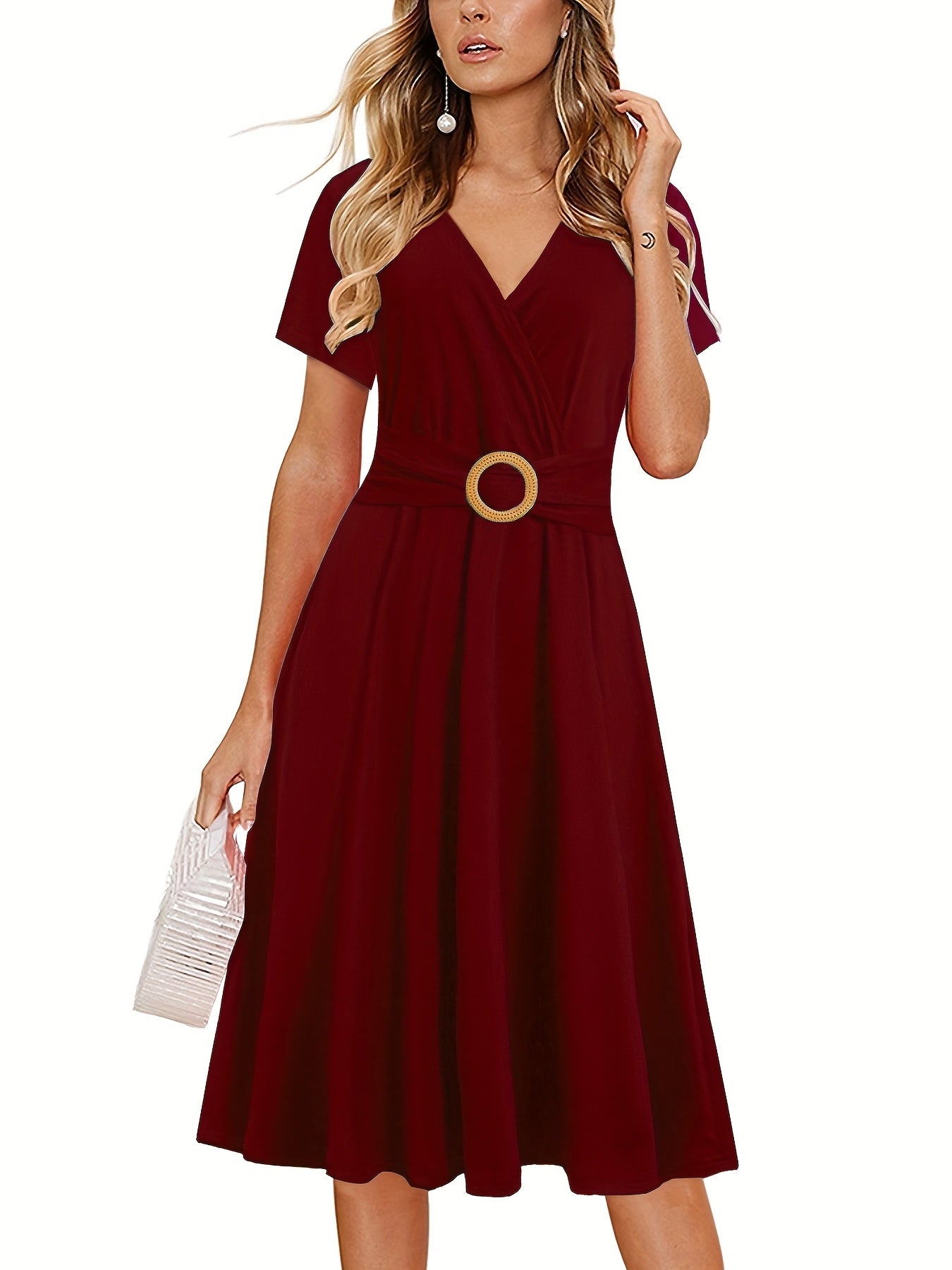 Short Sleeve V Neck Dress, Solid Casual Dress For Summer & Spring, Women's Clothing